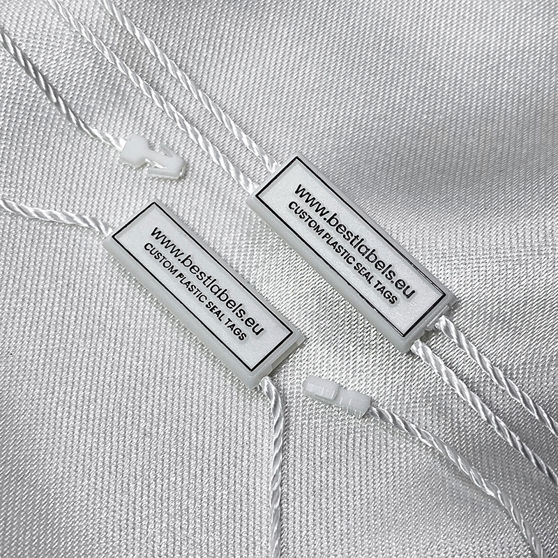 Custom plastic seal tag ST-M147 for fashion products, such as clothes, footwear, bags, jewelry, clothing accessories, etc.