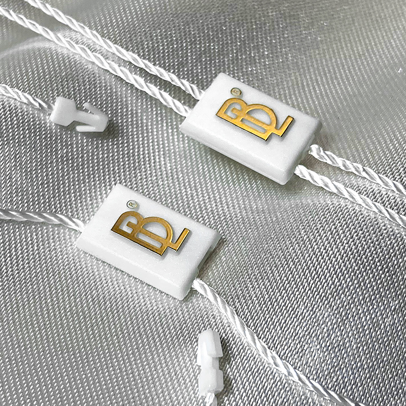 Custom plastic seal tag ST-M162 for fashion products, such as clothes, footwear, bags, jewelry, clothing accessories, etc.